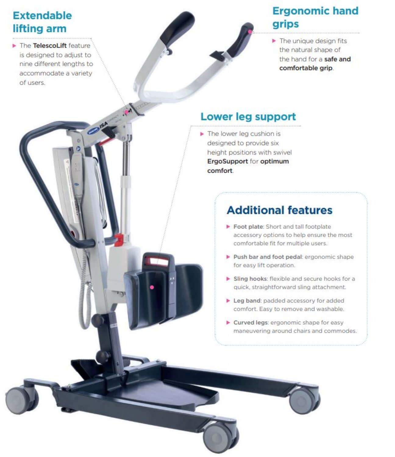 - FEATURES: The new battery powered Premier Series Invacare Stand Assist Lift offers optimal functionality and innovative features. The adjustable lower leg support, extendable lifting arm and ergonomic hand grips provide maximum comfort and security when transferring individuals. Removable foot plate allows for gait-training and restorative care